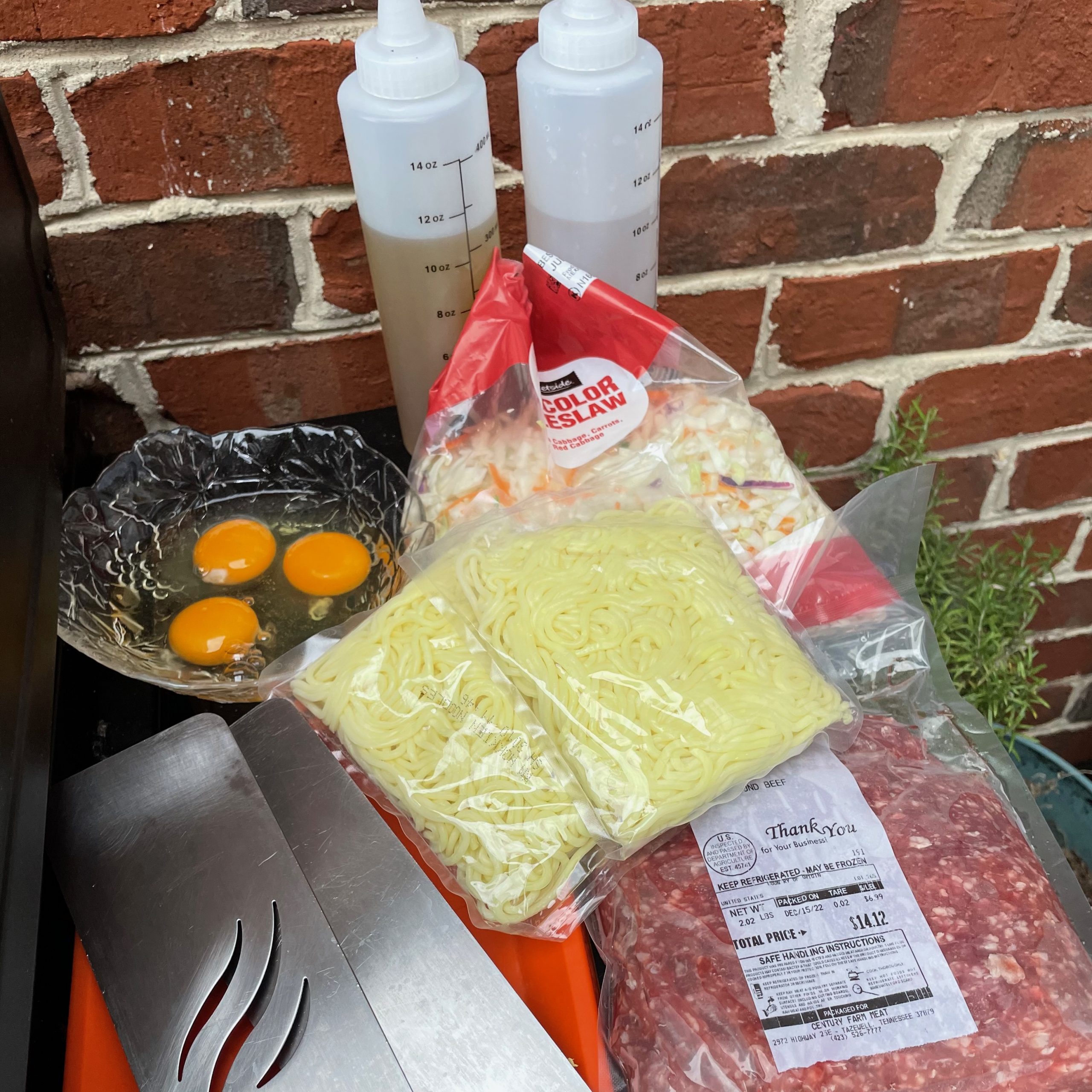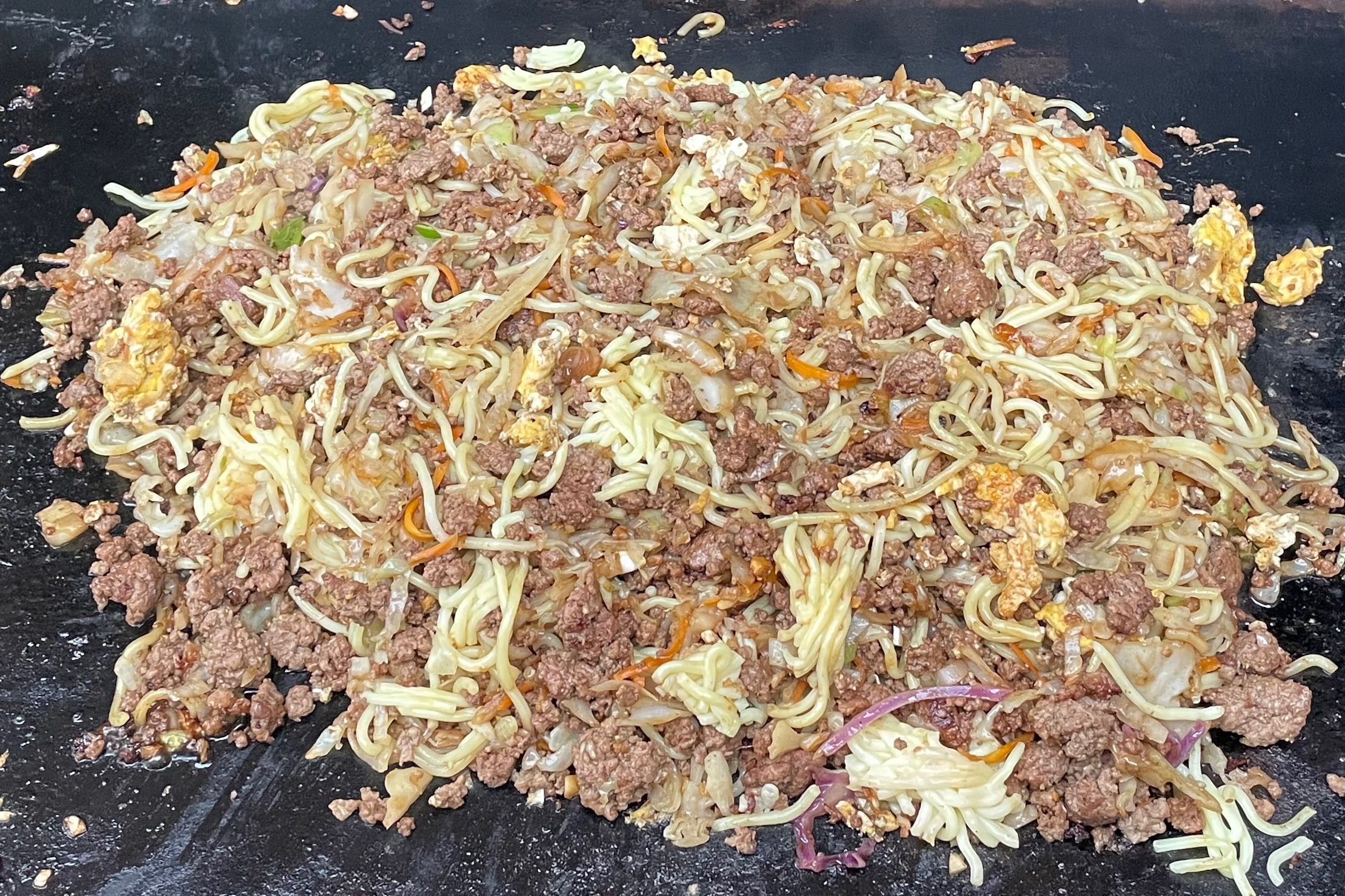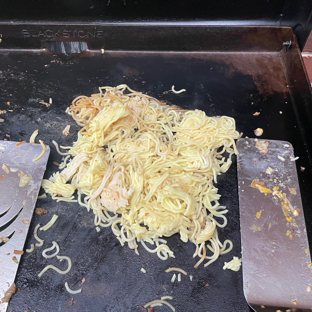 - Pour a drizzle of water on the Blackstone and dump the noodles on, then drizzle more water on the noodles.