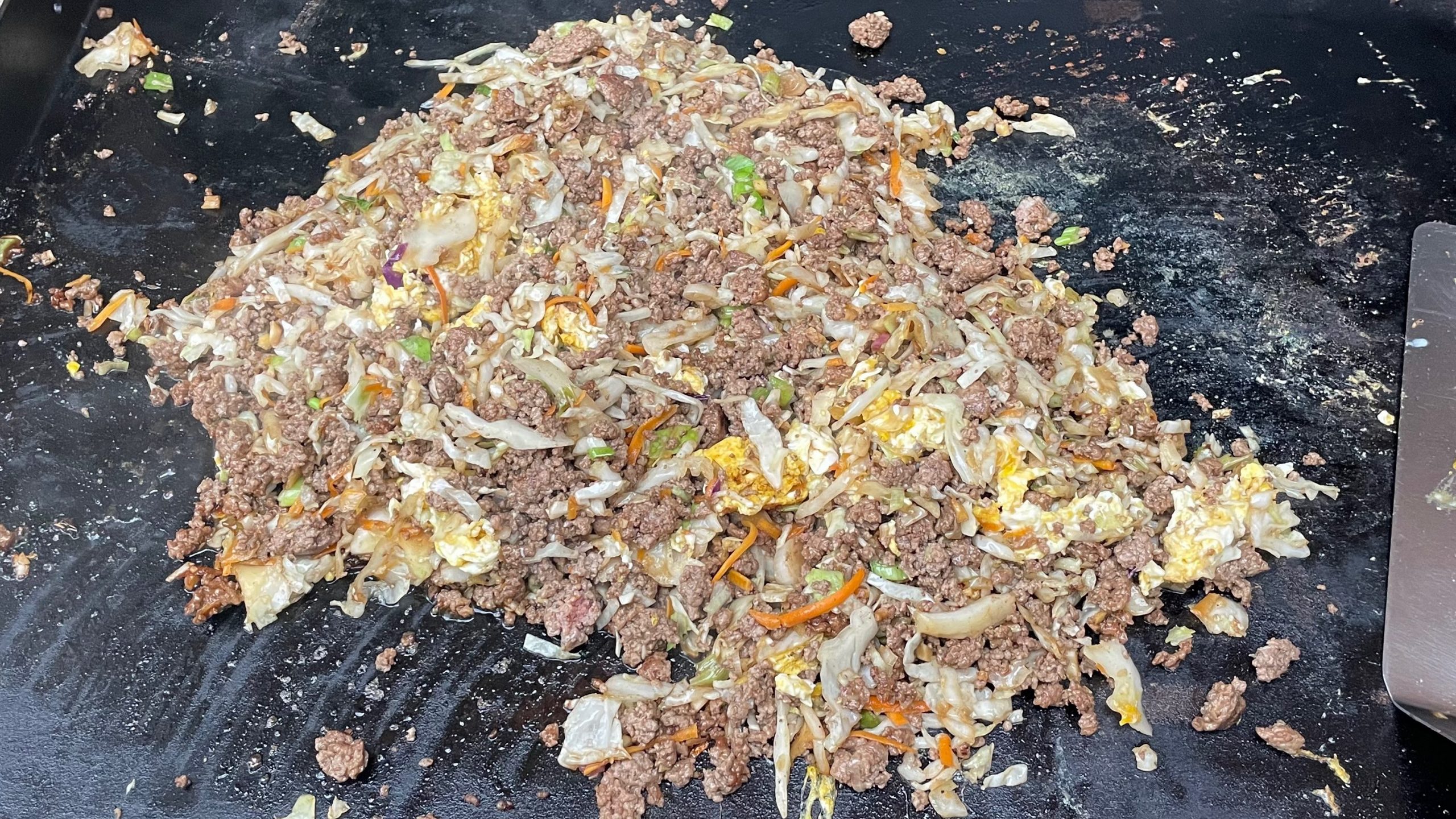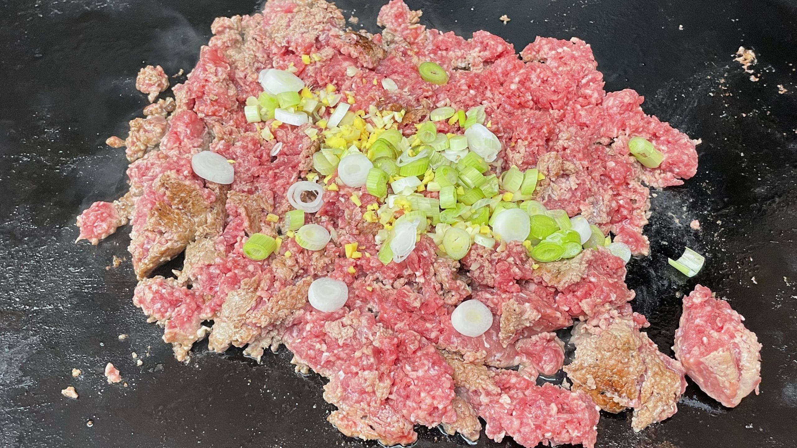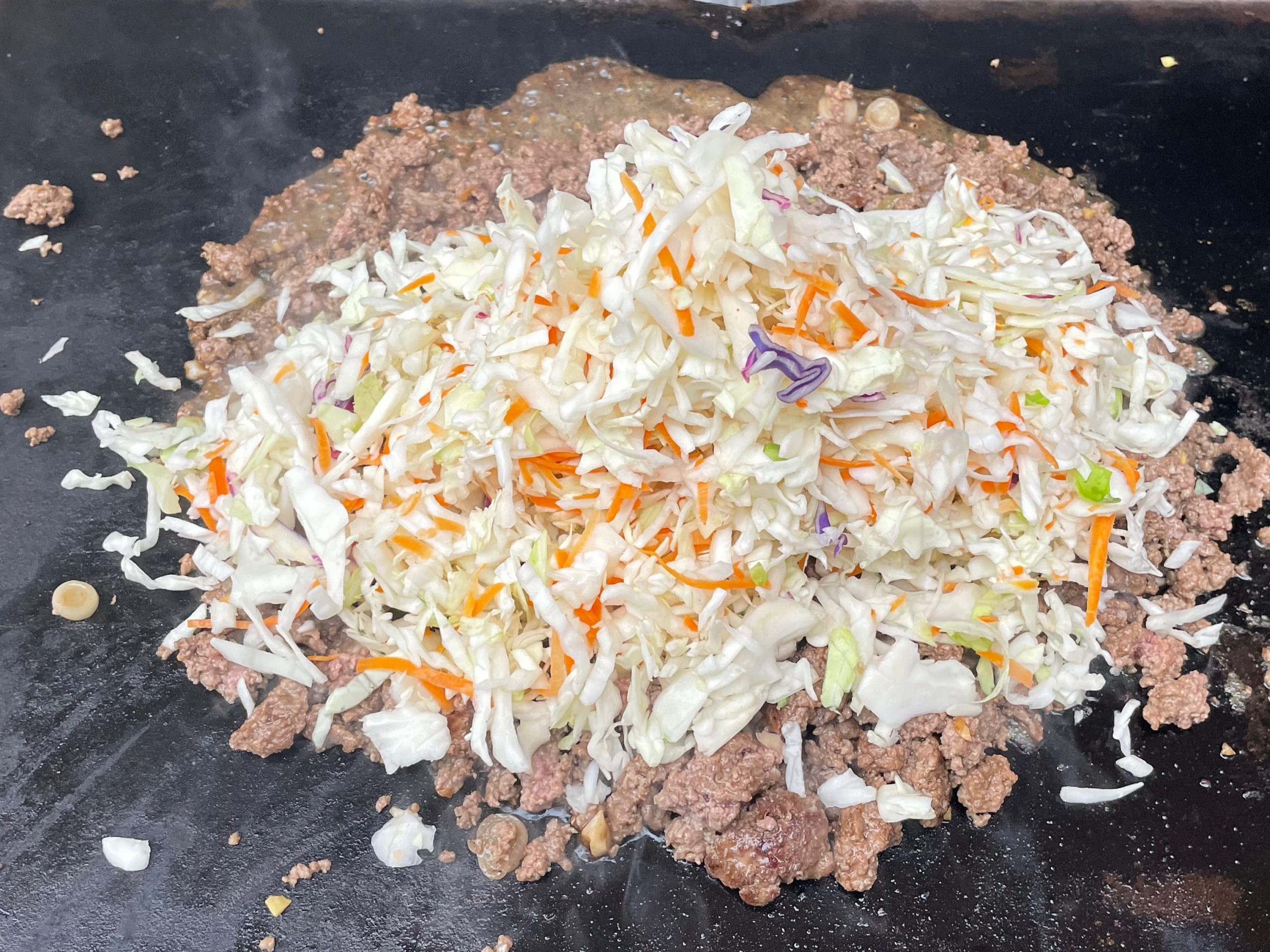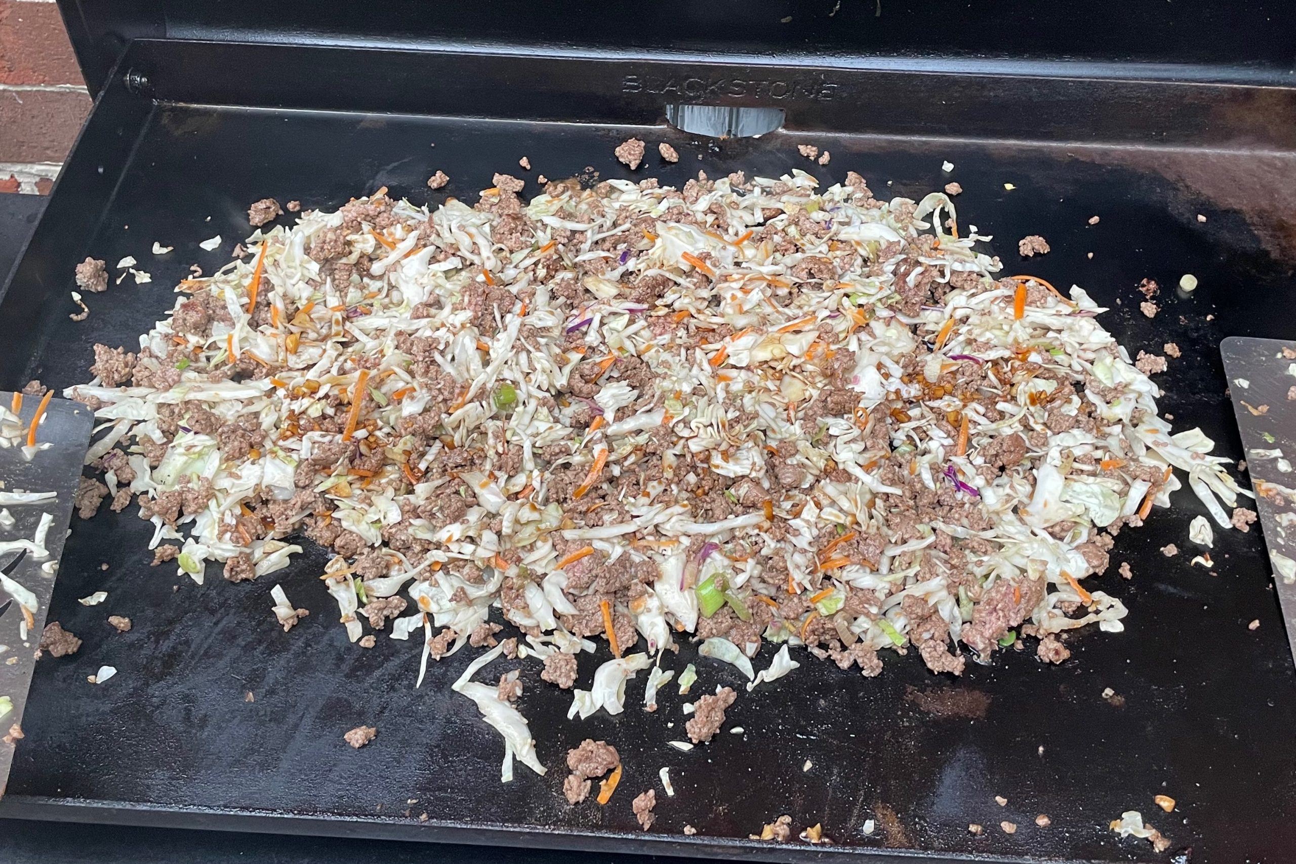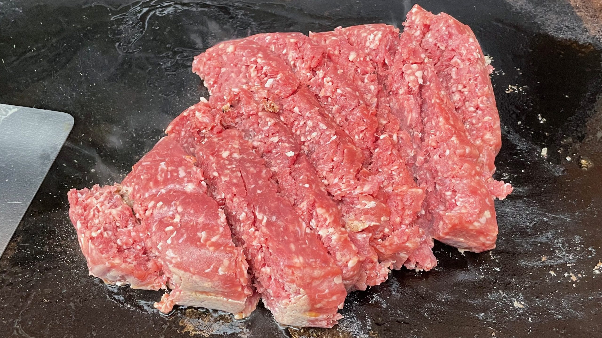 - Put Ground Beef (or Ground Pork) on Blackstone and break it up.