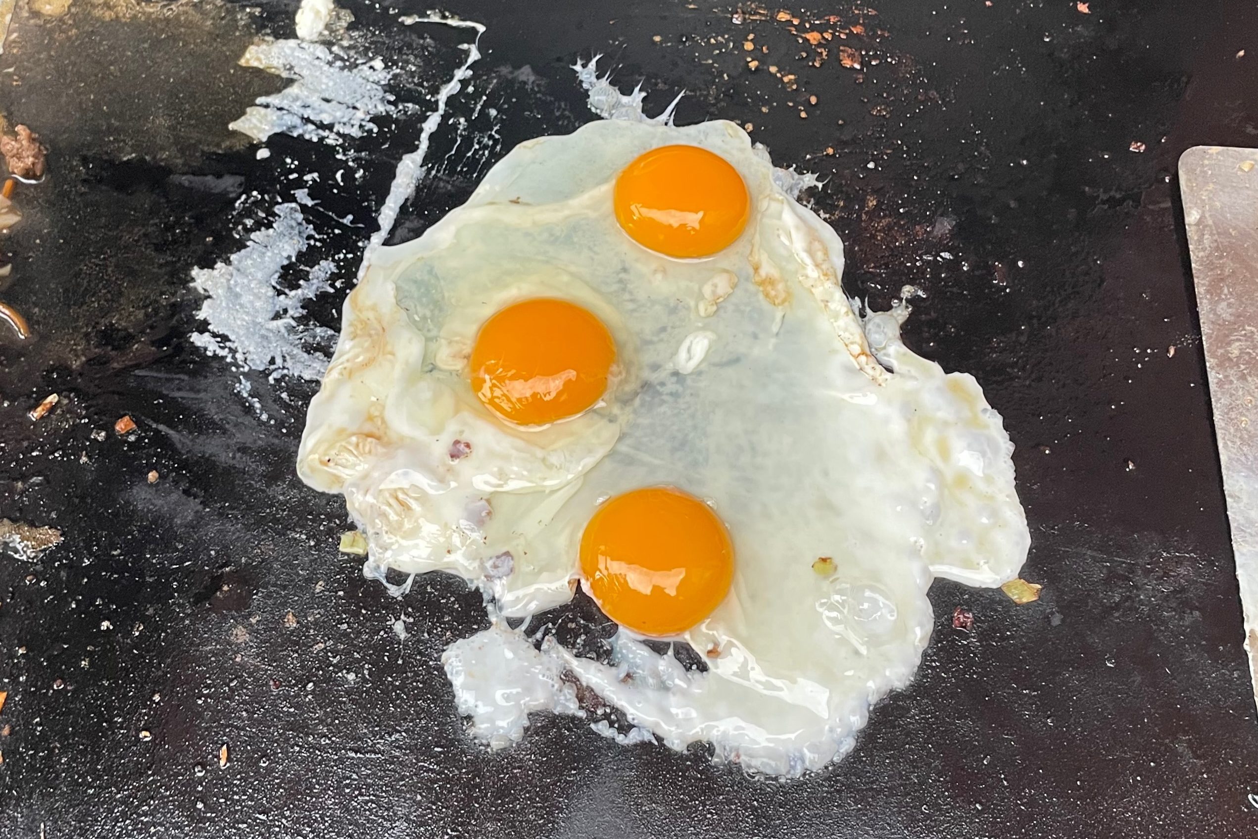 - Add 3 eggs to the Blackstone, and scramble them on the Blackstone.