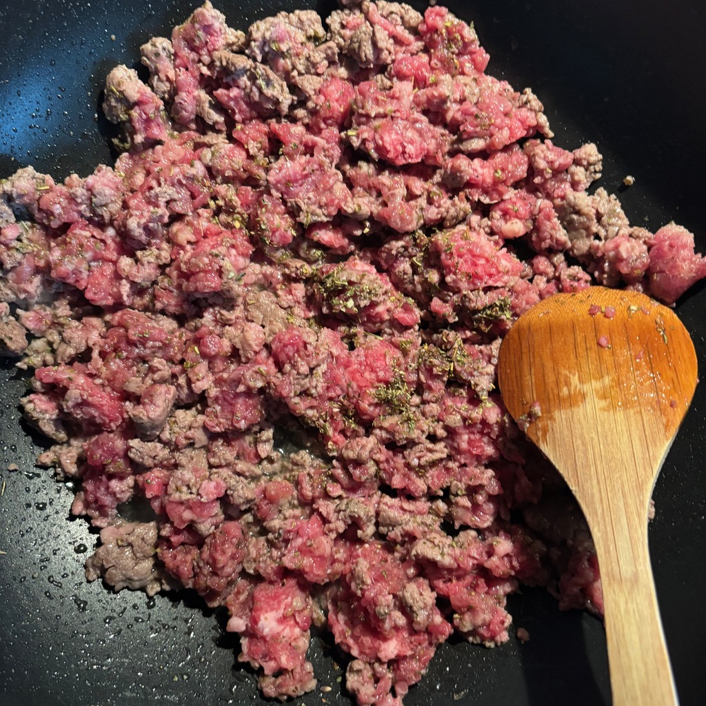 • Warm 1 tbsp olive oil in a large skillet over medium-high heat. Add the ground brisket (or other ground meat), breaking it up. Season with Italian seasoning, garlic salt, black pepper, and red pepper flakes if using. Cook until browned with crisped edges, 6–8 minutes.