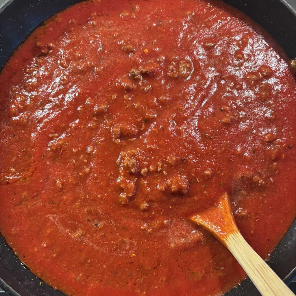 • Stir in tomato sauce. Bring to a gentle simmer and cook 10–15 minutes, stirring occasionally, until thickened and glossy. Taste and adjust salt/pepper.